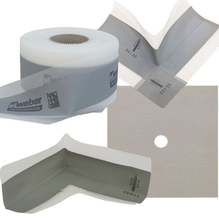 Das weber.tec uni Dichtungsband und die Fittings bestehen aus thermoplastischem Elastomer (TPE) mit einer Polyestermatrix. Sie zeichnen sich durch den universellen Einsatz in Kombination mit flexiblen Abdichtungsmaterialien aus – vor allem mit der Flüssigfolie weber.tec 822, aber auch mit den Dichtschlämmen weber.tec 824 und webertec Superflex D3 .< /p>
