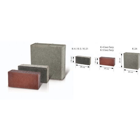 Den klassiske, rektangul?re formen p? belegningssteinene K-4, K-5 og K-21 gj?r at produktet lar deg skape rolige, enkle overflater samt mer komplekse m?nstre. Bruken av en st?rre kvadratisk K-24-kube vil diversifisere prosjektene. Kubene varierer i tykkelse (fra 5 til 8 cm), s? du kan velge passende variant avhengig av forventet trafikk og belastning. I tillegg utvider et bredt spekter av farger disse mulighetene, og muliggj?r fargeskille mellom rom med forskjellige funksjoner. K-4 og K-5 belegningsstein kommer i to varianter: med eller uten fas.