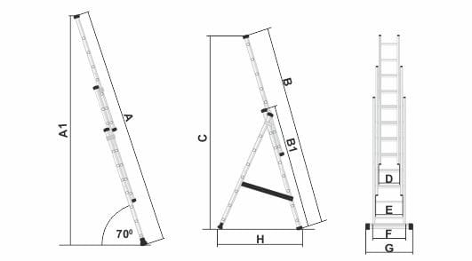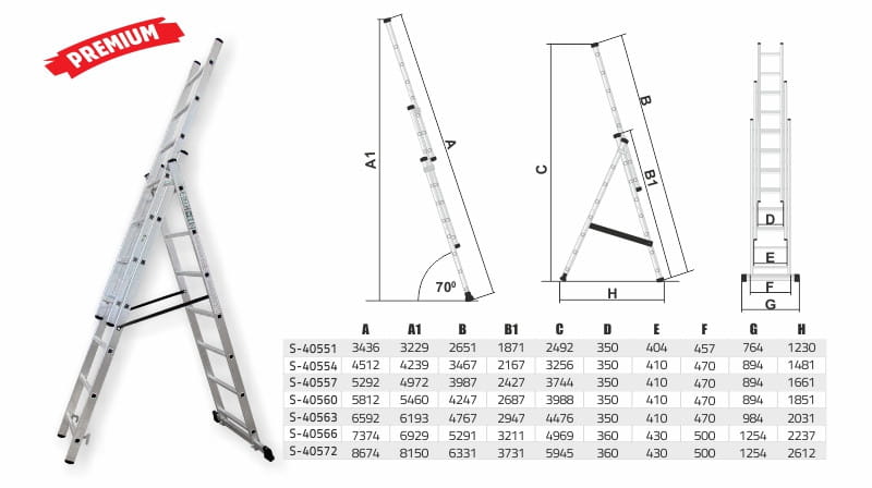 Drabina ALU 3x8 stopni, obciążenie 150 kg, A1-5,4 m, C-4 m, 3-elementowa, S-40560