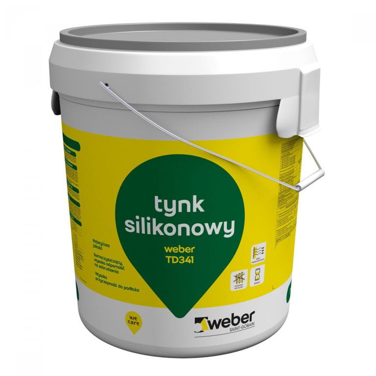 Nazwa krótka: Tynk silikonowy WEBER TD341, Baranek 2 mm, 30 kg Nazwa długa: Tynk silikonowy WEBER TD341, Baranek 2 mm, 30 kg, zużycie 2,2 kg/m2 Opis: Silikonowa masa tynkarska Weber TD341 jest fabrycznie barwionym produktem, dostarczanym w wiadrach, w formie pasty, gotowym do użycia na placu budowy po, uprzednim przemieszaniu. Produkt oparty o środek wiążący na bazie żywic silikonowych (krzemoorganicznych) oraz mineralne kruszywa strukturalne. Użyte w tynku surowce gwarantują gotowej zaprawie tynkarskiej wysoką trwałość oraz długotrwałą ochronę przed zabrudzeniami. Tynk posiada powłokowe zabezpieczenie przeciwko porastaniu algami i grzybami.