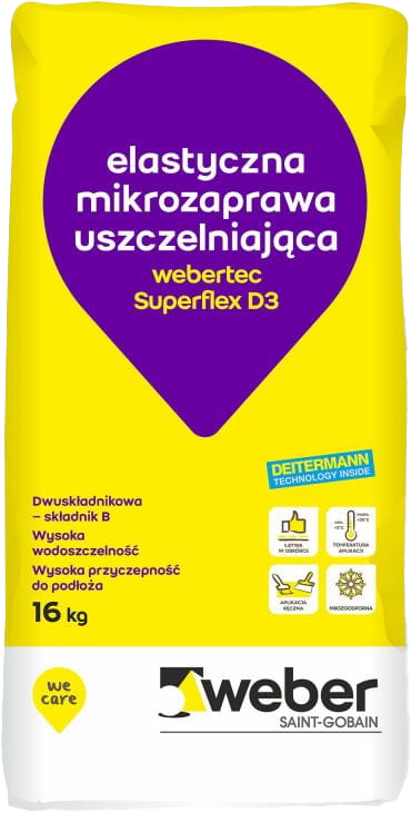 webertec Superflex D3 er en hydraulisk herdende, to-komponent vanntettende mikrom?rtel basert p? sement, utvalgte tilslag, spesielle tilsetningsstoffer og vannb?rne syntetiske harpikser. Klasse CM O2P i henhold til PN-EN 14891:2012, PN-EN 14891:2012/AC:2012 - Sementprodukt modifisert med polymerer (CM), ugjennomtrengelig for vann, brukt i flytende form, med evne til ? bygge bro over sprekker ved lav temperatur (-20°C), motstandsdyktig mot klorvann (O2P). For bruk under keramiske fliser utend?rs, p? horisontale og vertikale flater og i sv?mmebasseng.