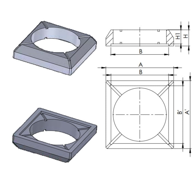 Nazwa krótka: Pierścień odciążający 315 tworzywowy uniwersalny pod teleskop D400 i B125 Nazwa długa: Pierścień odciążający 315 tworzywowy uniwersalny pod teleskop D400 i B125 Opis: Uniwersalny adapter osłonowo-wspierający włazy teleskopowe DN315 klasy B125 i D400. Adapter ustawiany jest bezpośrednio pod korpusem włazu żeliwnego i posadowiony w konstrukcji drogi. W nawierzchniach bitumicznych strona skośna jest stroną wspierającą właz, natomiast w nawierzchni brukowej właz jest osadzony w zagłębieniu osłonowym adaptera - stona kwadratowa. Adapter osadzony jest na podbudowie cementowej w nawierzchni brukowej. W nawierzchni bitumicznej wymagane jest wykonanie poprawnego wypełnienia oraz zagęszczenia warstwy bitumicznej pod adapterem.