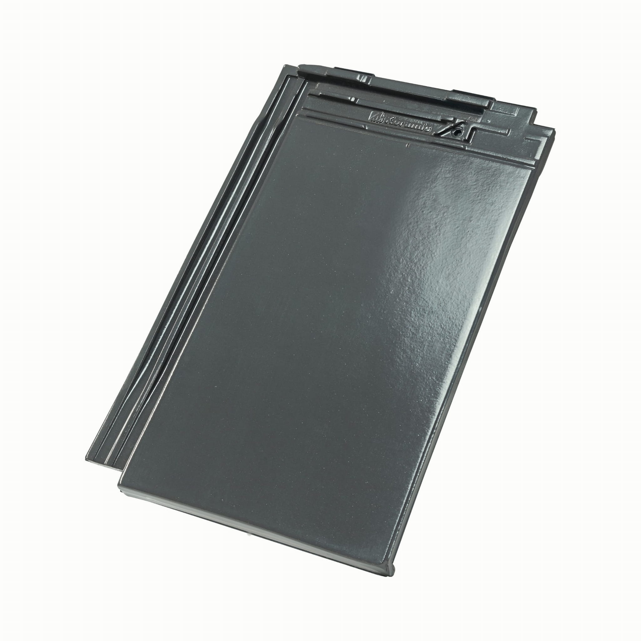 Modern storformat keramiska platta takpannor i färgen ädel grafit engobe. När den placeras p? en sluttning skapar den intrycket av ett slätt, nästan texturfritt tak.