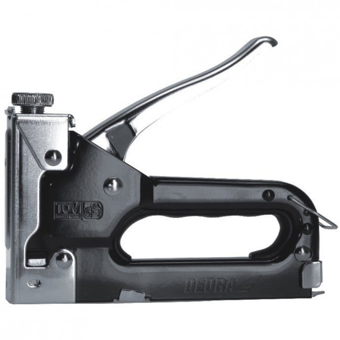 En häftapparat utformad för att fästa textilmaterial p? en trä- eller träliknande bas.