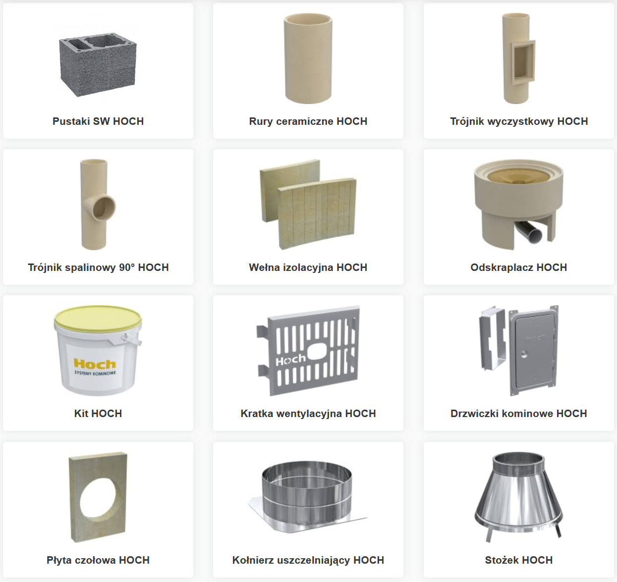 Dla systemu kominowego HOCH Uniwersal w skład zestawu podstawowego wchodzą:pustaki, rury ceramiczne, trójnik wyczystkowy, trójnik spalinowy 90°, odskraplacz, wełna izolacyjna, kit, kratka wentylacyjna, drzwiczki kominowe, płyta czołowa, kołnierz uszczelniający ze stożkiem, szablon do otworów, instrukcja montażu.